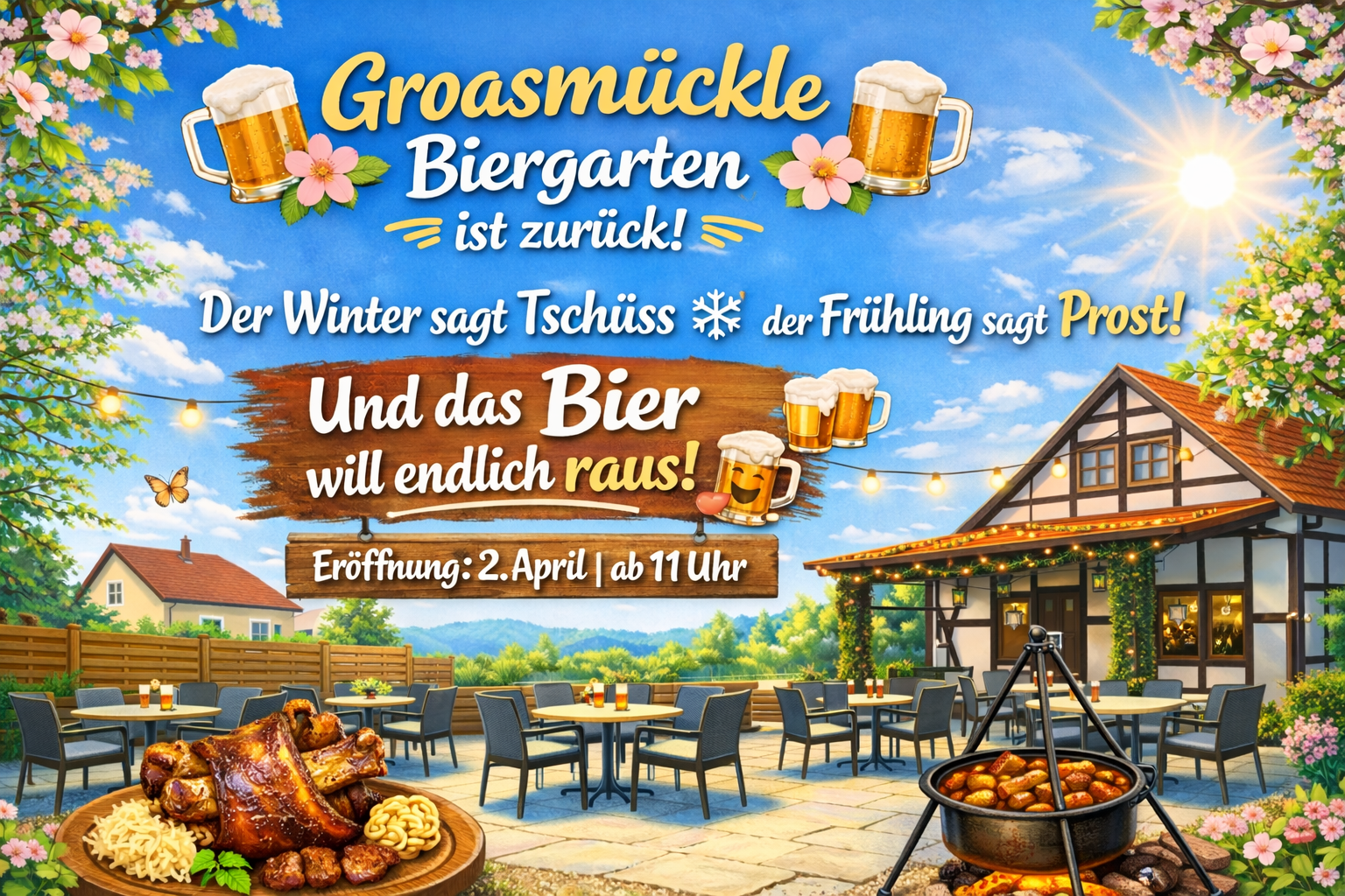 Lassen Sie sich von der idyllischen Atmosphäre unseres Biergartens verzaubern! Das Groasmückle liegt eingebettet in die malerische Umgebung von Tauberbischofsheim und ist der perfekte Ort, um bei einem kühlen Bier und bayerischen Schmankerln die Seele baumeln zu lassen. Umgeben von üppigem Grün und mit viel Platz für Geselligkeit bietet unser Biergarten einen Ort der Erholung für Einheimische und Gäste.