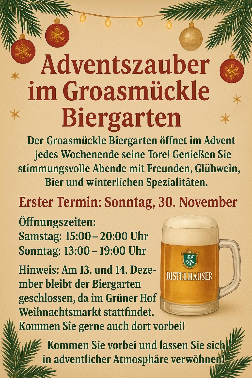 Ob mit Freunden, der Familie oder bei einem entspannten Feierabend – im Groasmückle Biergarten ist immer für eine angenehme Atmosphäre und gute Laune gesorgt. Lassen Sie sich von unserem freundlichen Service verwöhnen und verbringen Sie unvergessliche Stunden in unserem gemütlichen Biergarten.